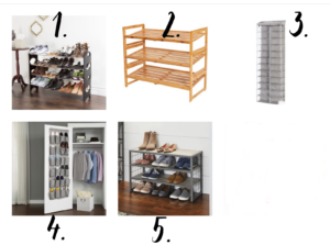 Also, shoe shelves make it easier to find a matching pair of shoes than if you’ve got them tossed in a bin. Here are some examples of handy shoe shelves.